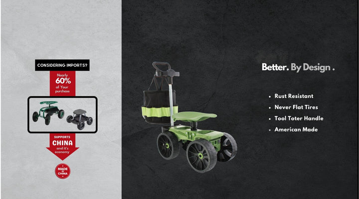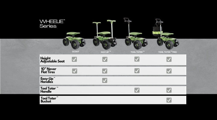 Choose the Wheelie™ that best fits your needs and projects. Use the Tool Toter™ handle to take a few favorite gardening or car wash tools right to your project. The Giddy-Up assists with getting up or down onto the seat area.